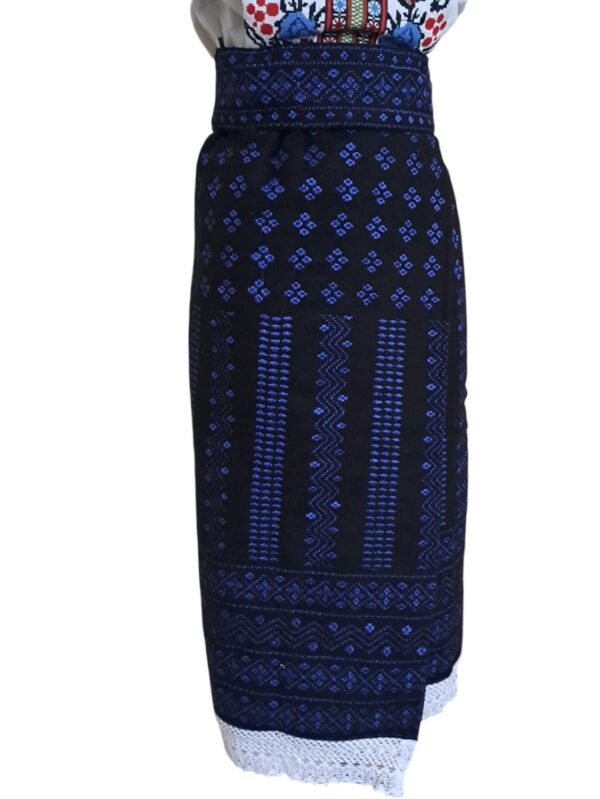 Costum traditional 2 piese, catrinta, brau. Catrinta este din stofa neagra, brodata cu fir albastru pe verticata si orizontala. Ca terminatie jos are dantela alba. Braul este din stofa ,brodata cu fir albastru. Braul este din stofa brodat.  Aceasta set este din zona Bucovinei si se poarta cu mandrie. Se poate purta pe dedesubt cu poale sau fara. 1 – Descriere marime catrinta; Catrinta are latime 146 cm , lungime 84 cm . Se potriveste pentru marimi de la S la 3XL Materialul este stofa din lana brodata cu fir rosu. Are aplicata dantela din bumbac ca terminatie. Este captusita si se aseaza foarte bine pe corp. Compozitie material; 58% lana,25% poliester ,8% acrilic, 7% naylon, 1% vascoza. Descriere marime brau; Braul are 140 cm lungime, 10 cm latime. Material; stofa din lana, brodata cu fir rosu. Compozitie material; 58% lana,25% poliester ,8% acrilic, 7% naylon, 1% vascoza.