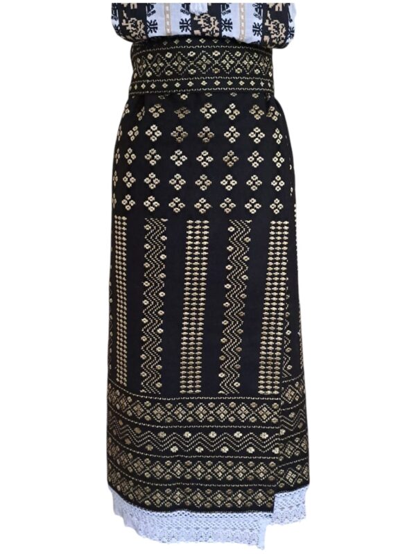 Costum traditional 2 piese, catrinta, brau. Catrinta este din stofa neagra, brodata cu fir auriu pe verticata si orizontala. Ca terminatie jos are dantela alba. Braul este din stofa ,brodata cu fir auriu. Braul este din stofa brodat. Aceasta set este din zona Bucovinei si se poarta cu mandrie. Se poate purta pe dedesubt cu poale sau fara. 1 – Descriere marime catrinta; Catrinta are latime 146 cm , lungime 84 cm . Se potriveste pentru marimi de la S la 3XL Materialul este stofa din lana brodata cu fir auriu. Are aplicata dantela din bumbac ca terminatie. Este captusita si se aseaza foarte bine pe corp. Compozitie material; 58% lana,25% poliester ,8% acrilic, 7% naylon, 1% vascoza. Descriere marime brau; Braul are 140 cm lungime, 10 cm latime. Material; stofa din lana, brodata cu fir auriu. Compozitie material; 58% lana,25% poliester ,8% acrilic, 7% naylon, 1% vascoza.