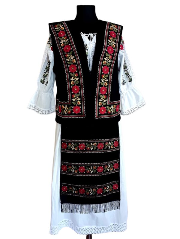 Costum traditional 2 piese, catrinta, brau . Catrinta este din stofa neagra, brodata cu fir bej pe verticata si orizontala. Ca terminatie jos are dantela alba. Braul este din stofa ,brodata cu fir bej. Braul este din stofa brodat. Aceasta set este din zona Bucovinei si se poarta cu mandrie. Se poate purta pe dedesubt cu poale sau fara.