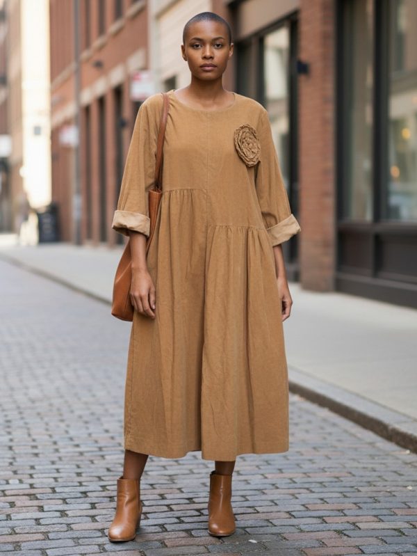 Croială lejeră, cu talie ușor căzută și fronseuri delicate.