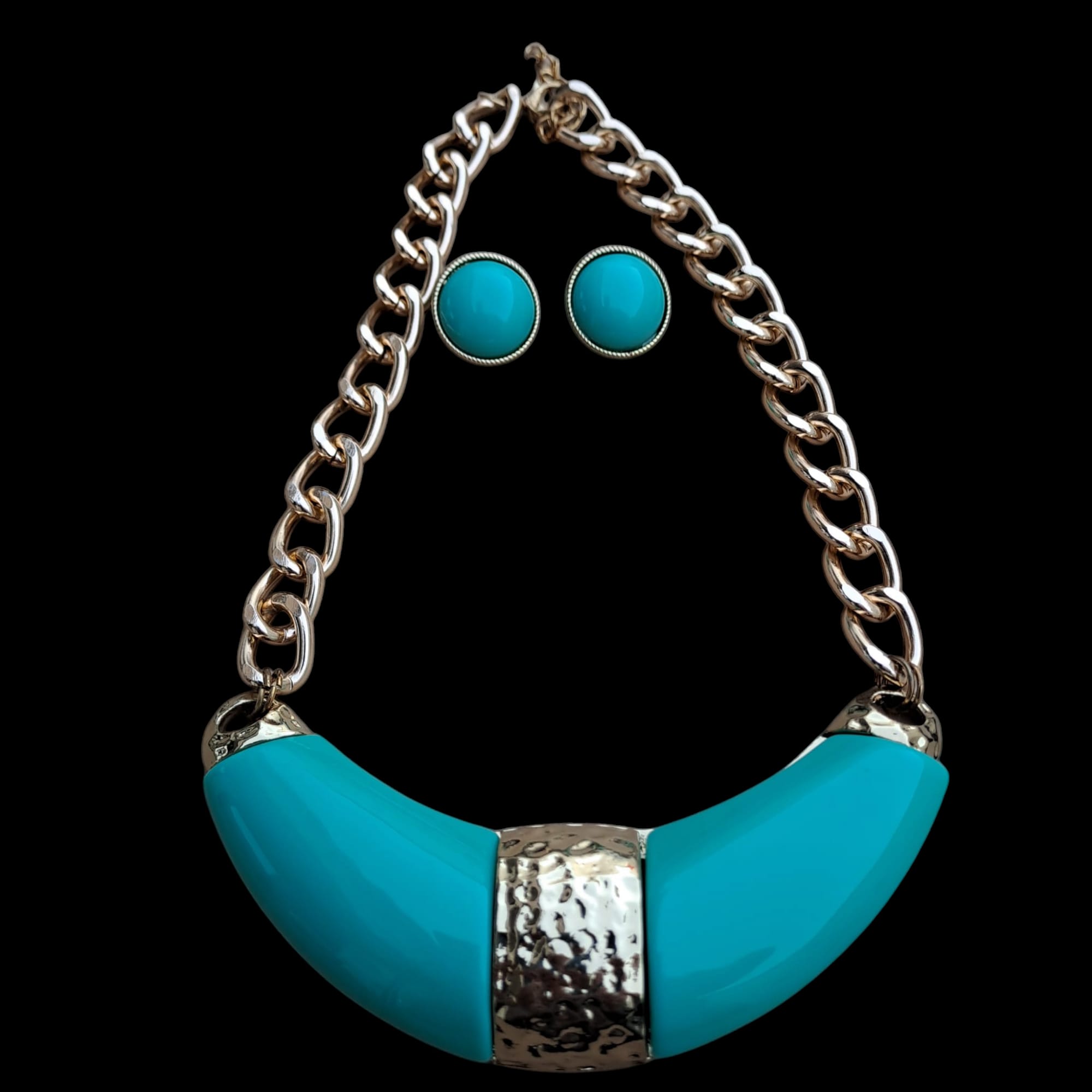 Acest set de bijuterii constă într-un colier statement și o pereche de cercei asortați. Colierul are un lanț metalic auriu, alcătuit din zale mari, oferindu-i un aspect elegant și modern. Elementul central al colierului este un pandantiv curbat, realizat din plastic lucios de culoare galben muștar, cu detalii metalice texturate în nuanță aurie, care adaugă un plus de rafinament.