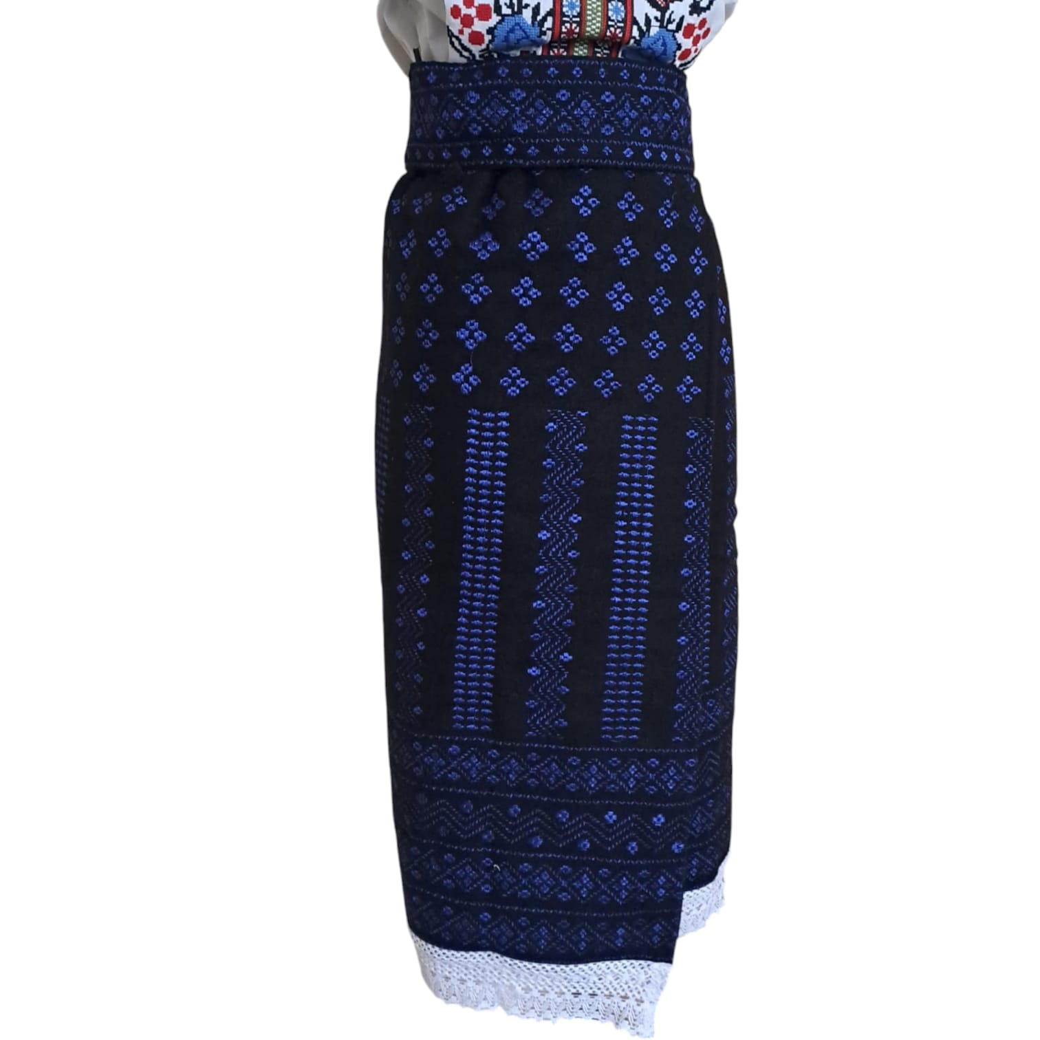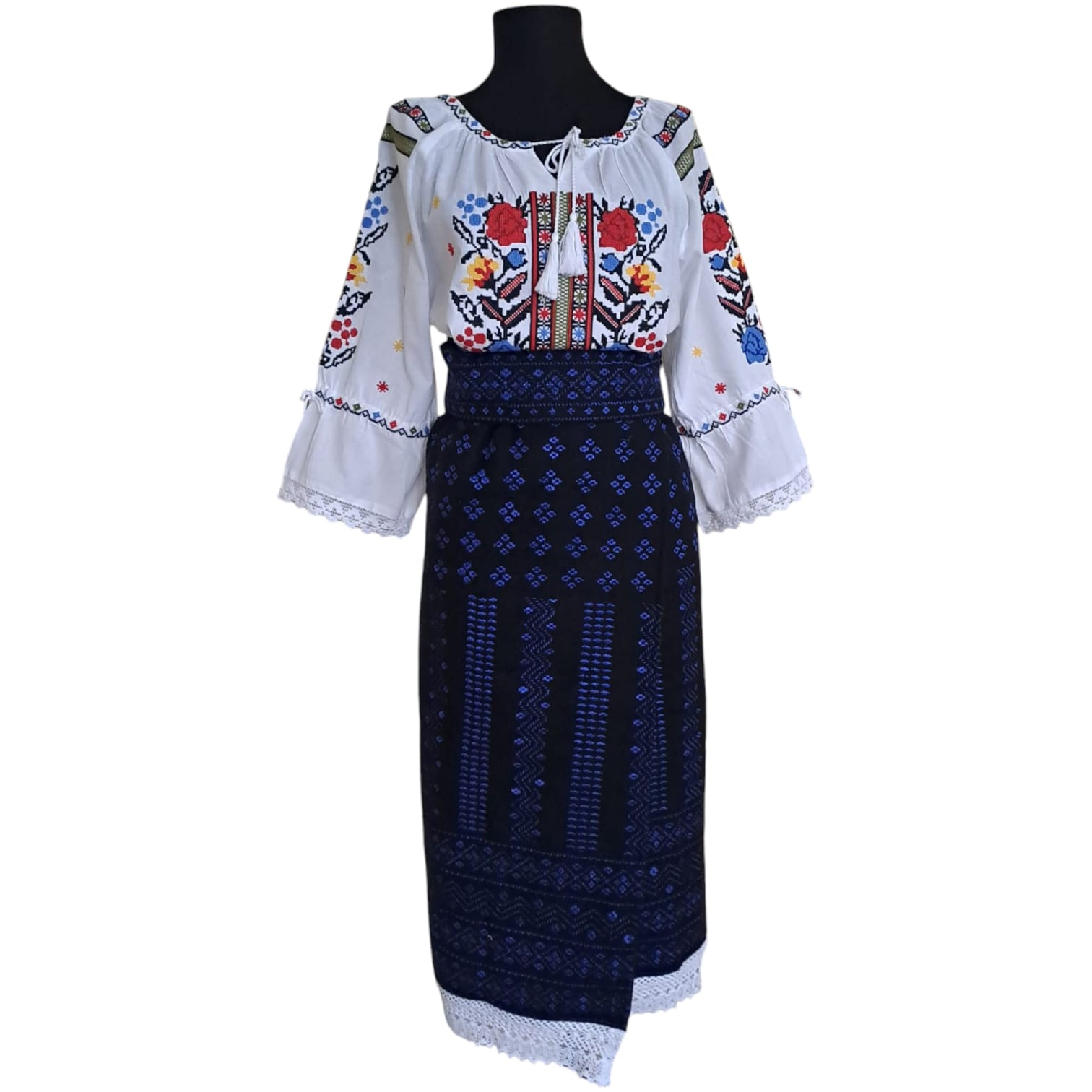 Costum traditional 2 piese, catrinta, brau. Catrinta este din stofa neagra, brodata cu fir albastru pe verticata si orizontala. Ca terminatie jos are dantela alba. Braul este din stofa ,brodata cu fir albastru. Braul este din stofa brodat. Aceasta set este din zona Bucovinei si se poarta cu mandrie. Se poate purta pe dedesubt cu poale sau fara.