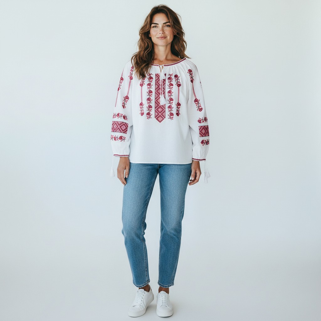 Motivele geometrice, inspirate din folclor, evocă stabilitatea, armonia și legătura dintre trecut și prezent. Fiecare detaliu transmite un mesaj subtil despre identitate și apartenență. Cu un croi confortabil și materiale de calitate, această ie este perfectă pentru a fi purtată atât la evenimente speciale, cât și în viața de zi cu zi.