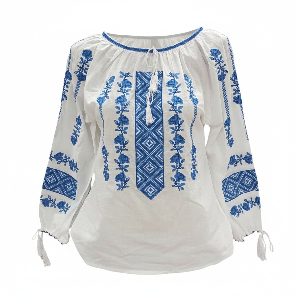 Ie tradițională românească cu broderie geometrică – echilibru și eleganță
