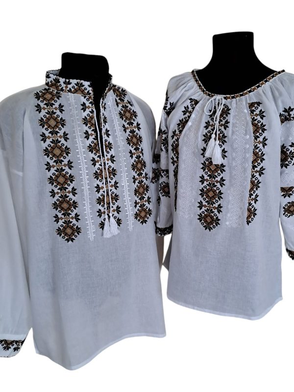 Setul format din ie pentru femei si camasa traditionala pentru barbat este fond alb , cu motive florale sau geometrice delicate, este decorată cu broderii tradiționale în tonuri contrastante, inspirate din motivele populare românești. Mânecile largi și croiala confortabilă oferă libertate de mișcare și eleganță, iar șnurul la gât adaugă un accent autentic.