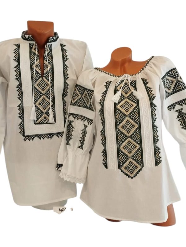 Setul format din ie pentru femei si camasa traditionala pentru barbat este fond alb , cu motive florale sau geometrice delicate, este decorată cu broderii tradiționale în tonuri contrastante, inspirate din motivele populare românești. Mânecile largi și croiala confortabilă oferă libertate de mișcare și eleganță, iar șnurul la gât adaugă un accent autentic.