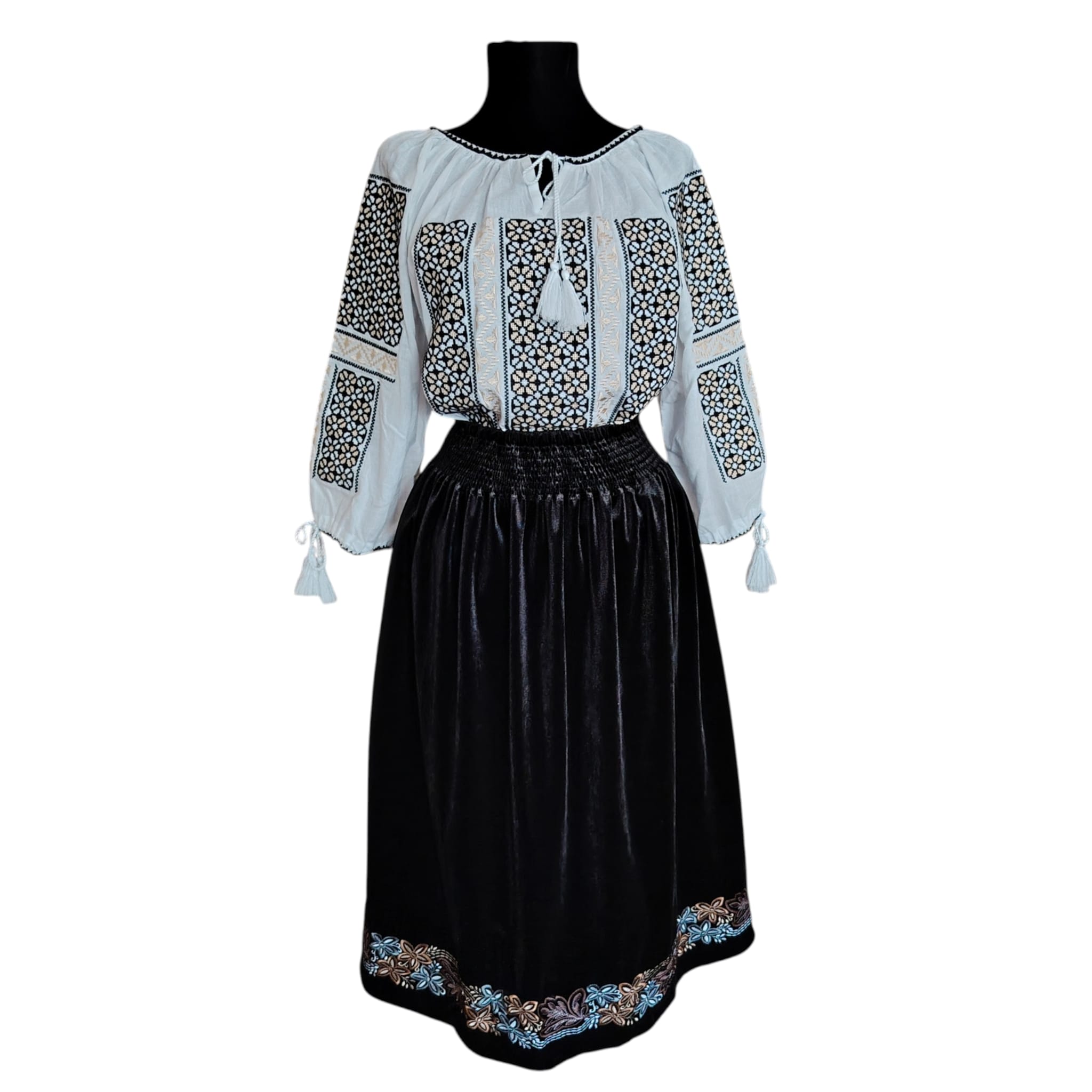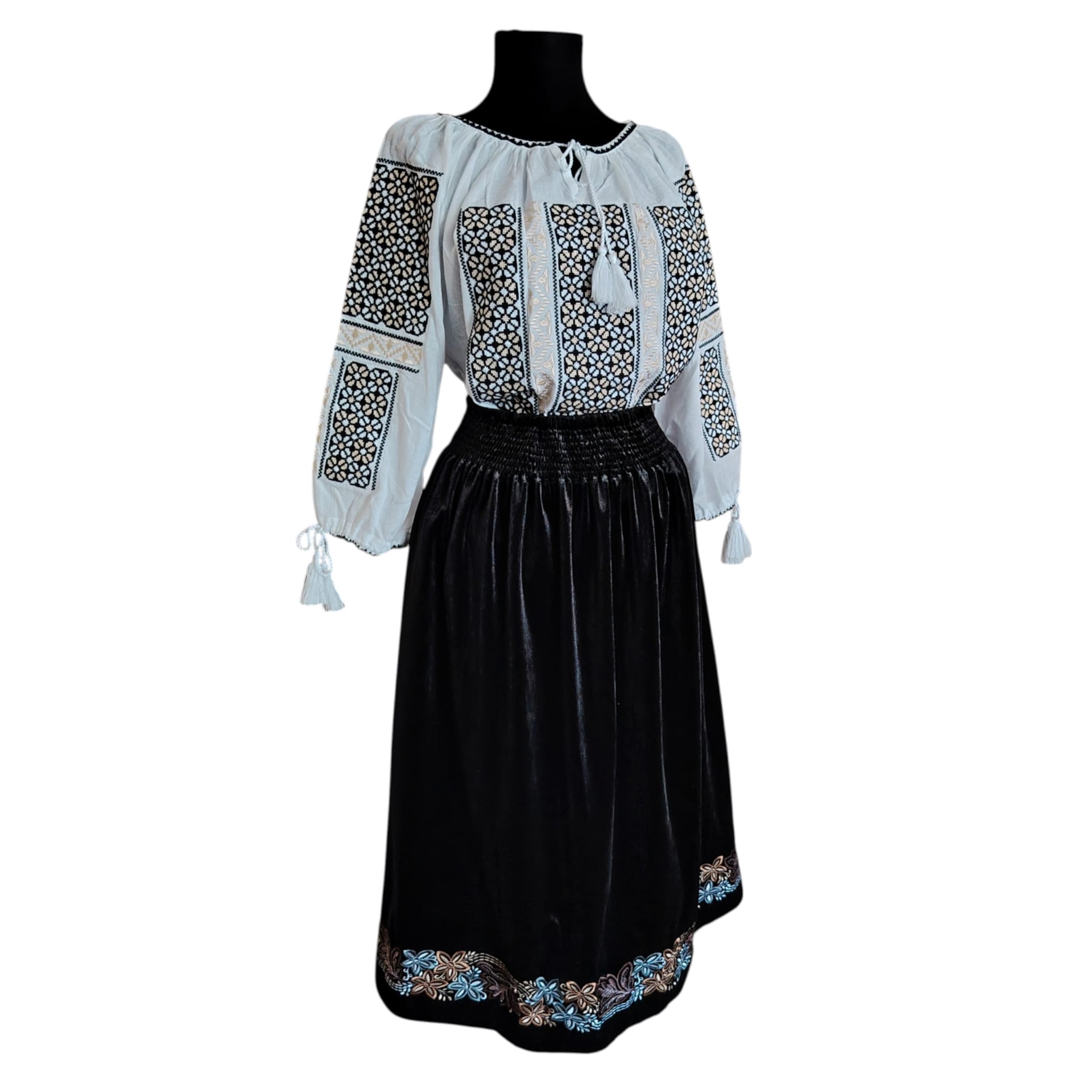 Descoperă frumusețea autentică a tradițiilor românești cu această ie tradițională lucrată cu atenție la detalii, completată perfect de o fustă din catifea cu broderii florale elaborate. Realizată din materiale naturale, această ținută este ideală pentru evenimente speciale, festivaluri sau pentru a adăuga un strop de unicitate garderobei tale.