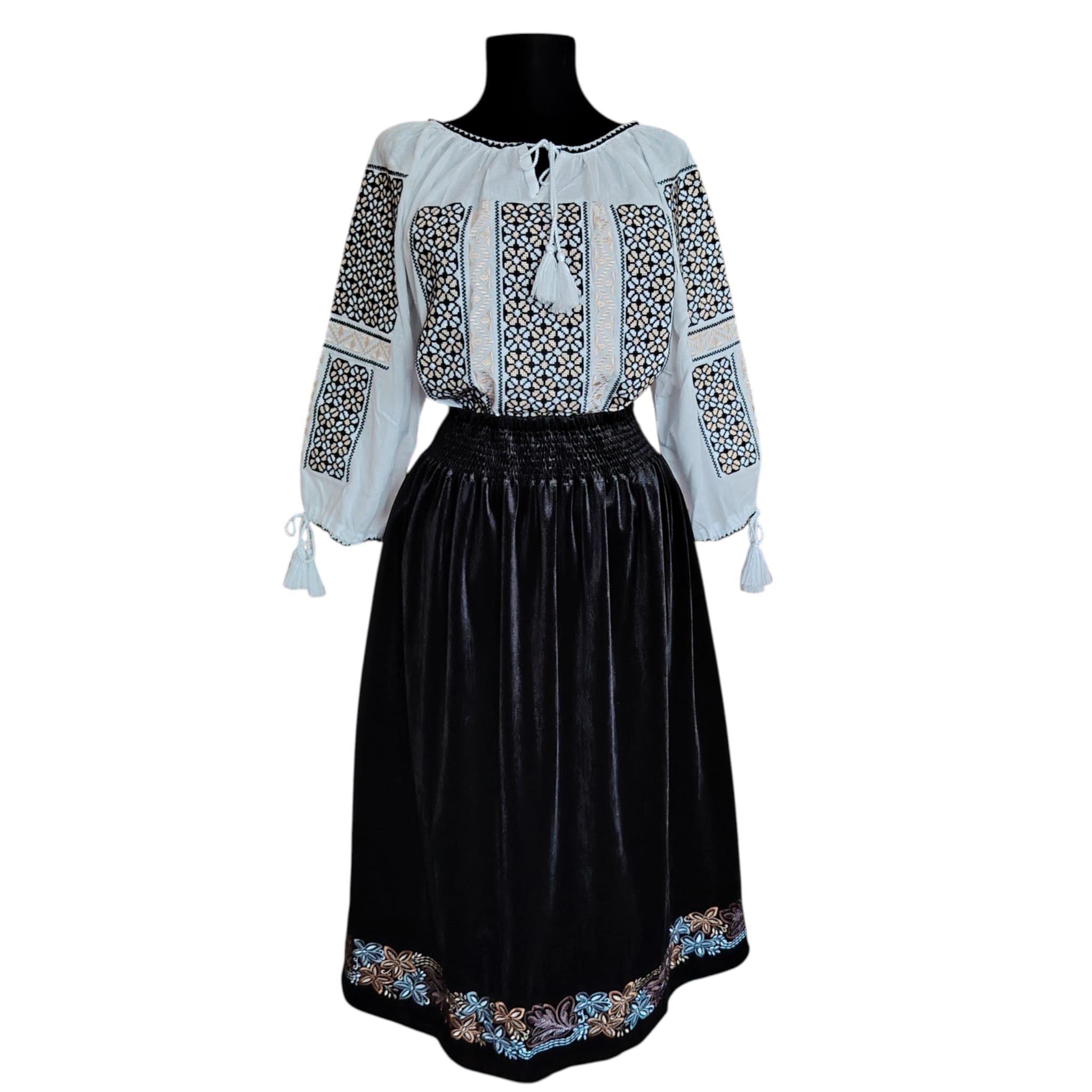 Fusta este din catifea, de o eleganță aparte, impresionează prin broderiile florale colorate și motivele complexe, fiind potrivită atât pentru ocazii formale, cât și pentru o ținută de zi memorabilă.