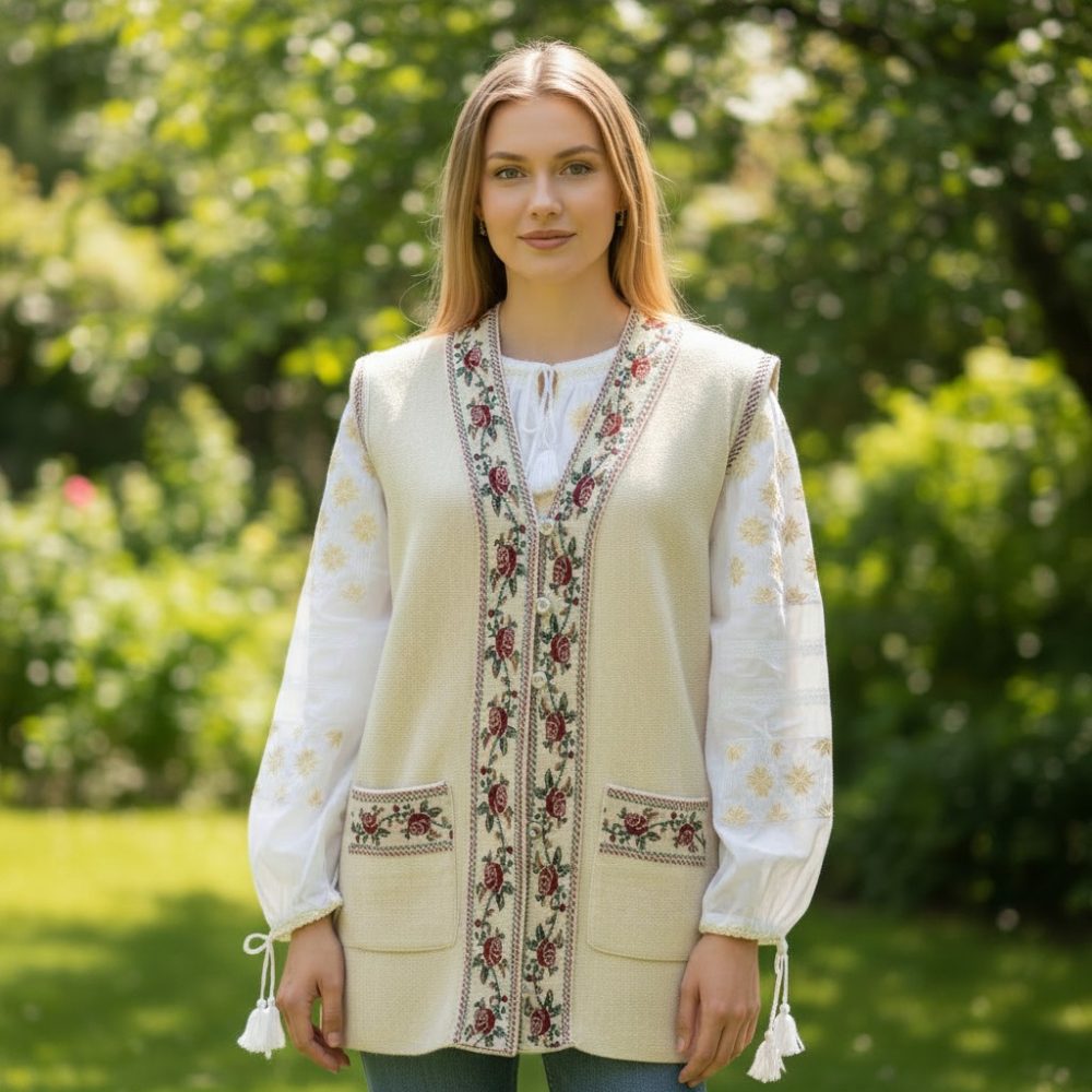 Vesta tricotata fond alb cu model floral. Are buzunare si inchidere cu nasturi.